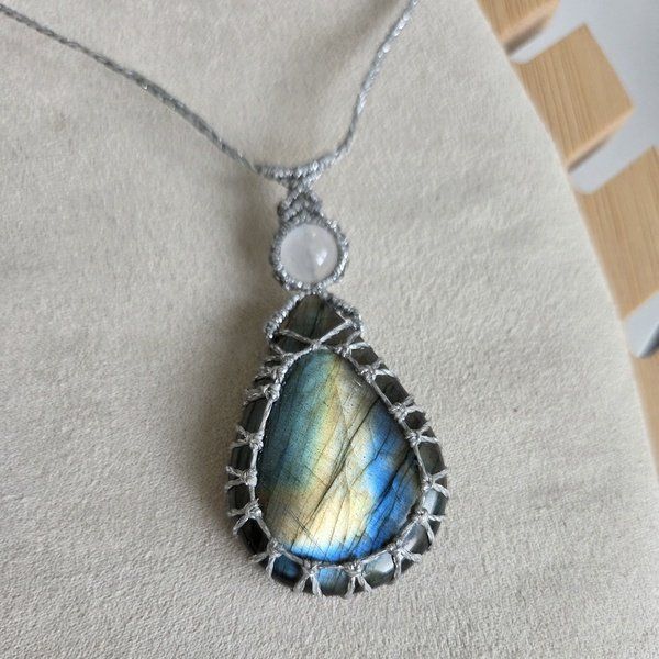 Ce pendentif serti et monté sur collier, réalisé à la main par mes soins vous apportera un soin énergétique pour favoriser la connexion avec vos guides spirituels, la connexion avec vous-même et également les bienfaits de la Pierre de Labradorite.